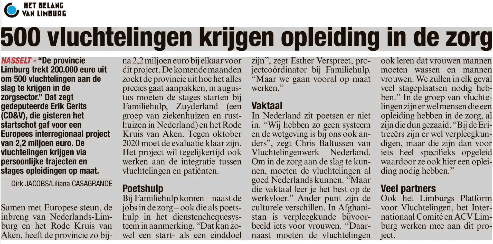 Het project beoogt vluchtelingen in de Euregio Maas en Rijn (Nederland, België, Duitsland) een stage en/of werkplek aan te bieden bij een zorg- of welzijnsorganisatie. Daarvoor wordt ook gewerkt aan het verbeteren van de perceptie van vluchtelingen bij onder meer zorgverleners, -organisaties en cliënten.