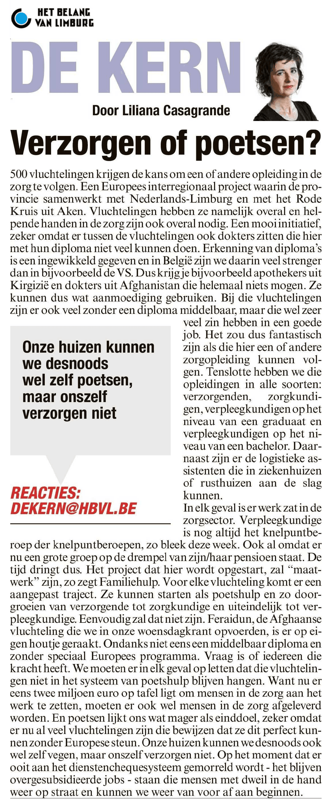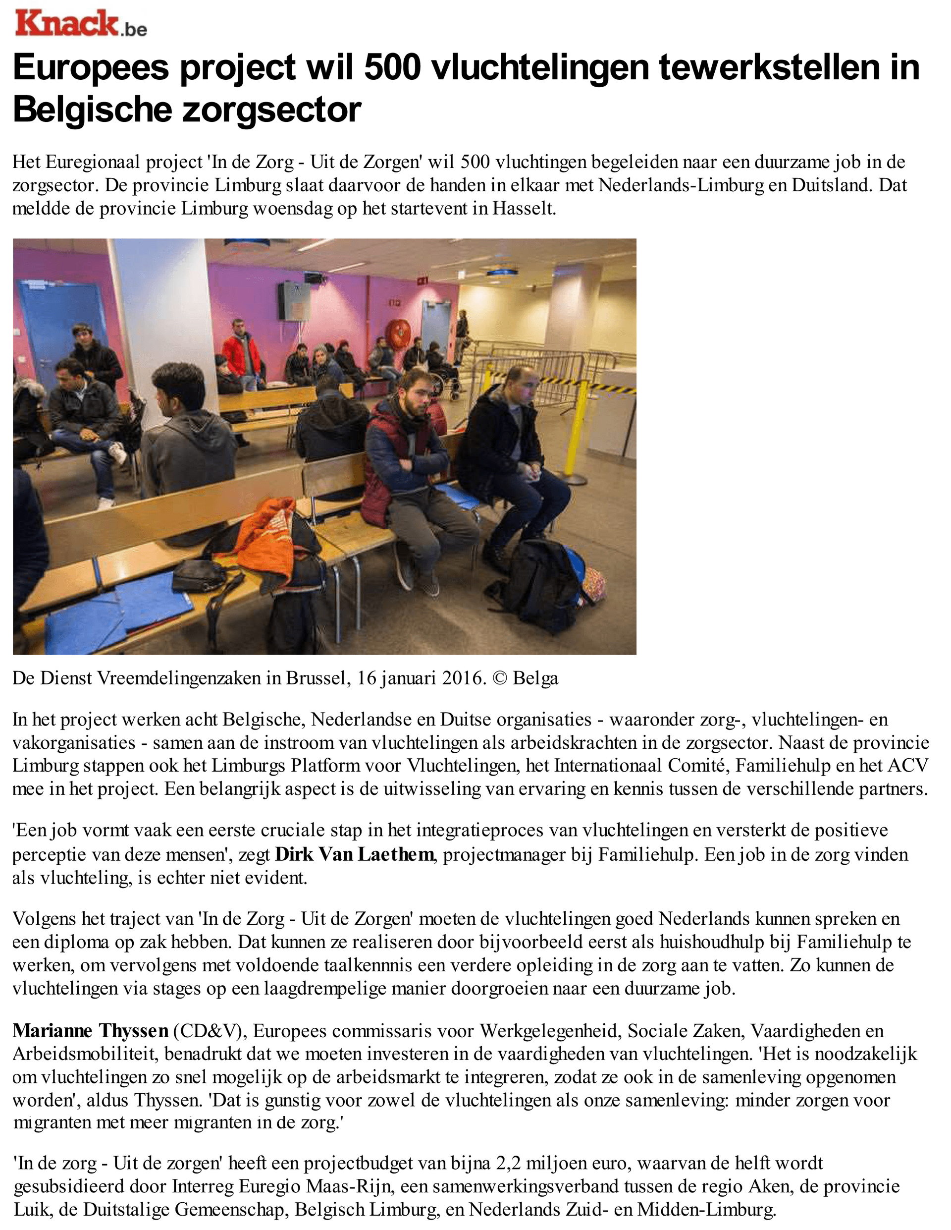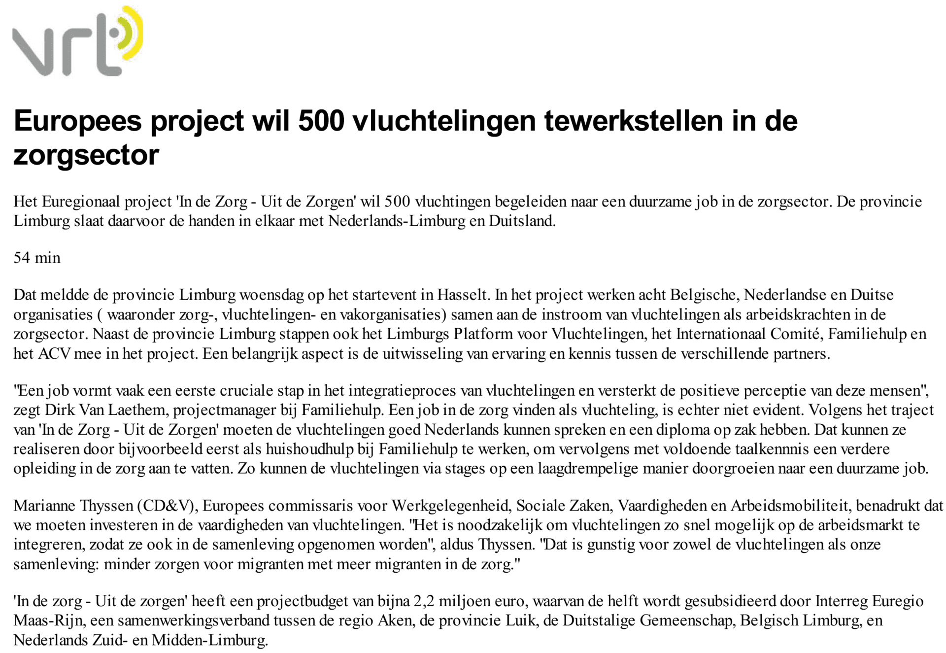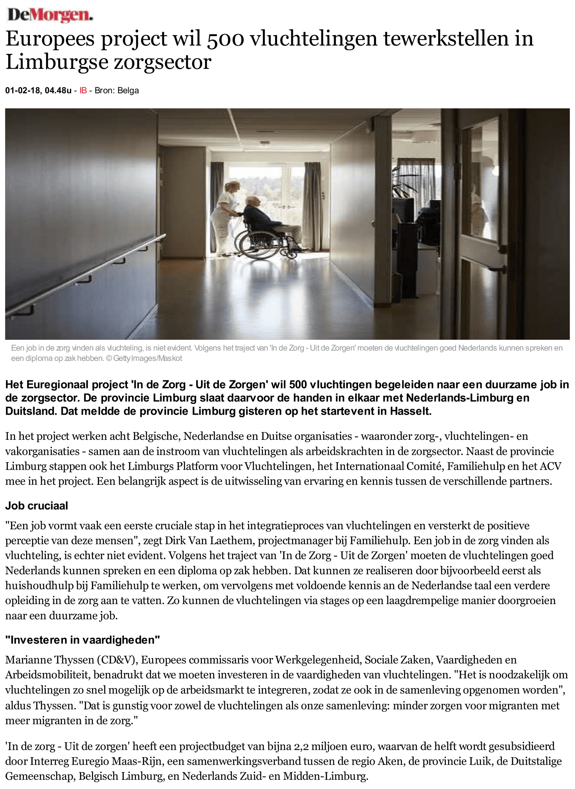 Woensdag 31 januari start om 15.30 uur in het Provinciehuis Hasselt (B) de kick-off bijeenkomst van het grensoverschrijdend Europees project ‘In de zorg – Uit de zorgen’.
